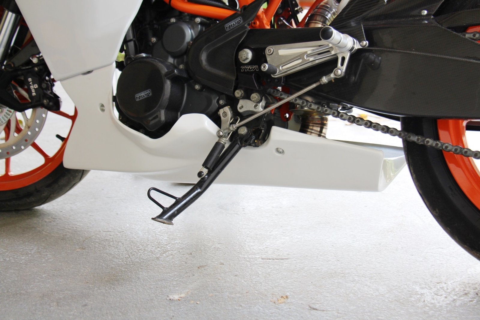 This belly pan follows the design of the KTM WSS300 but we have modified it so it can be used on the street too! This means that unlike the KTM design, you can install this belly pan with either the sidestand installed or not and use either a street or race gear shift. This belly pan is compatible with our WSS300 exhaust system EXPS-0111 and EXPS-0112.