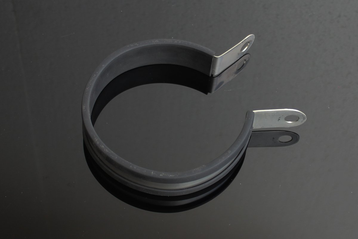 Stainless steel clamp. Round with rubber protection for a firm, but friendly grip on your silencer.