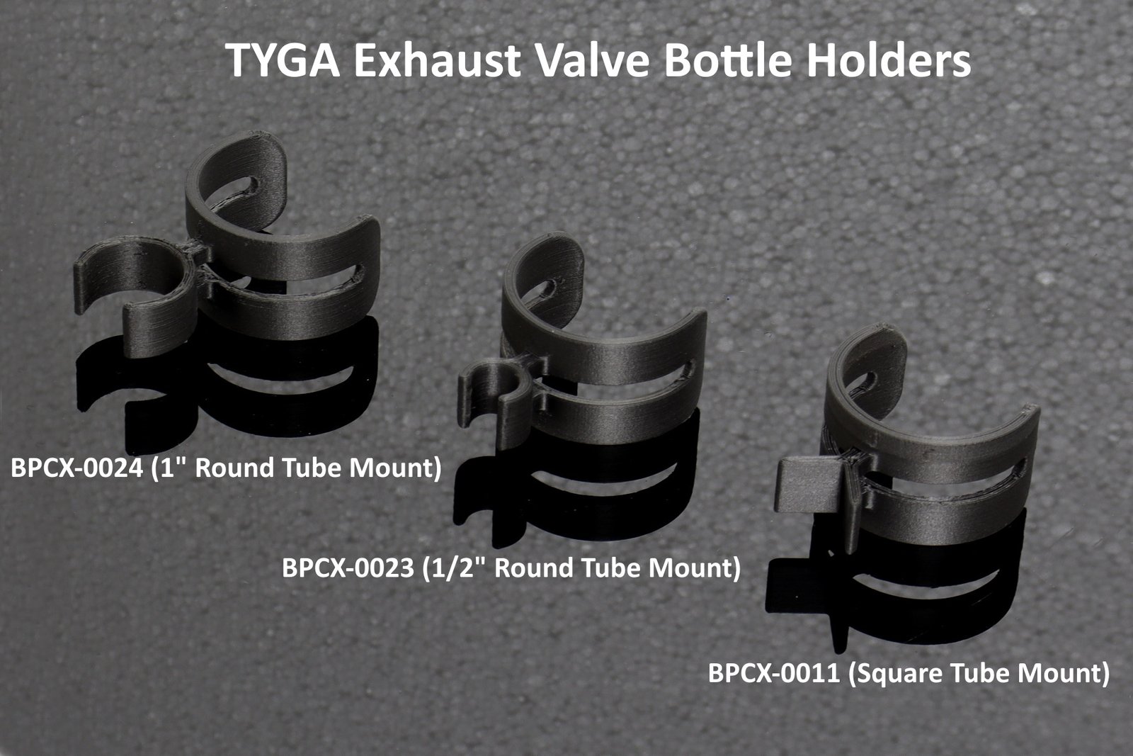 Besides this BPCX-0024 which mounts to a 1″ Round Tube we offer this exhaust valve bottle holder in 3 variations
