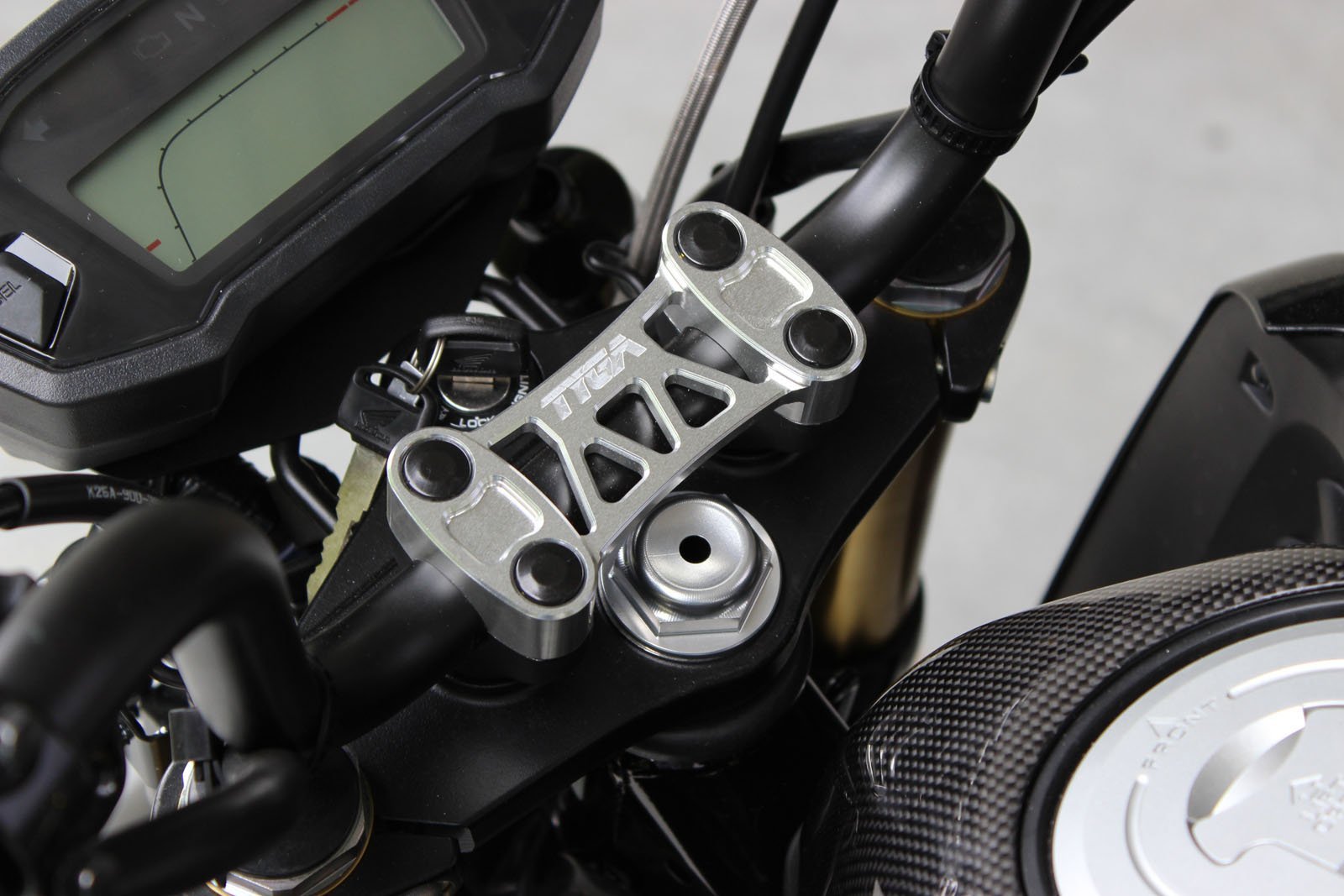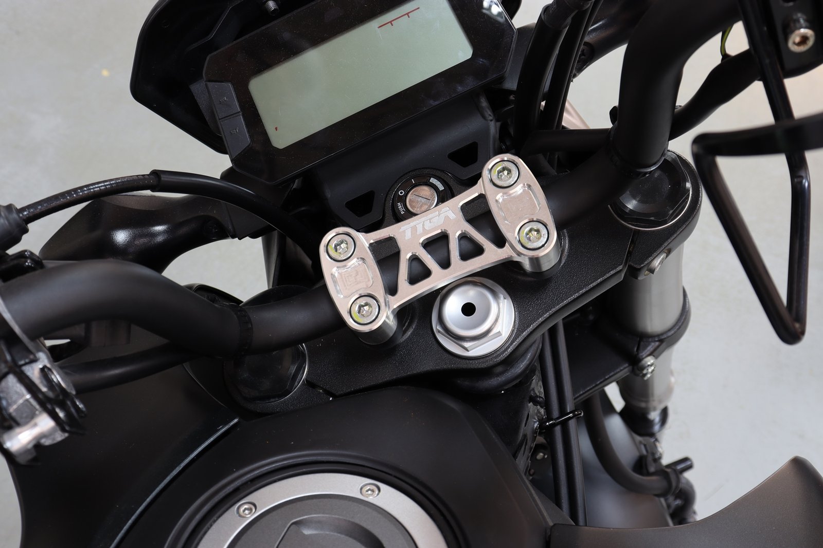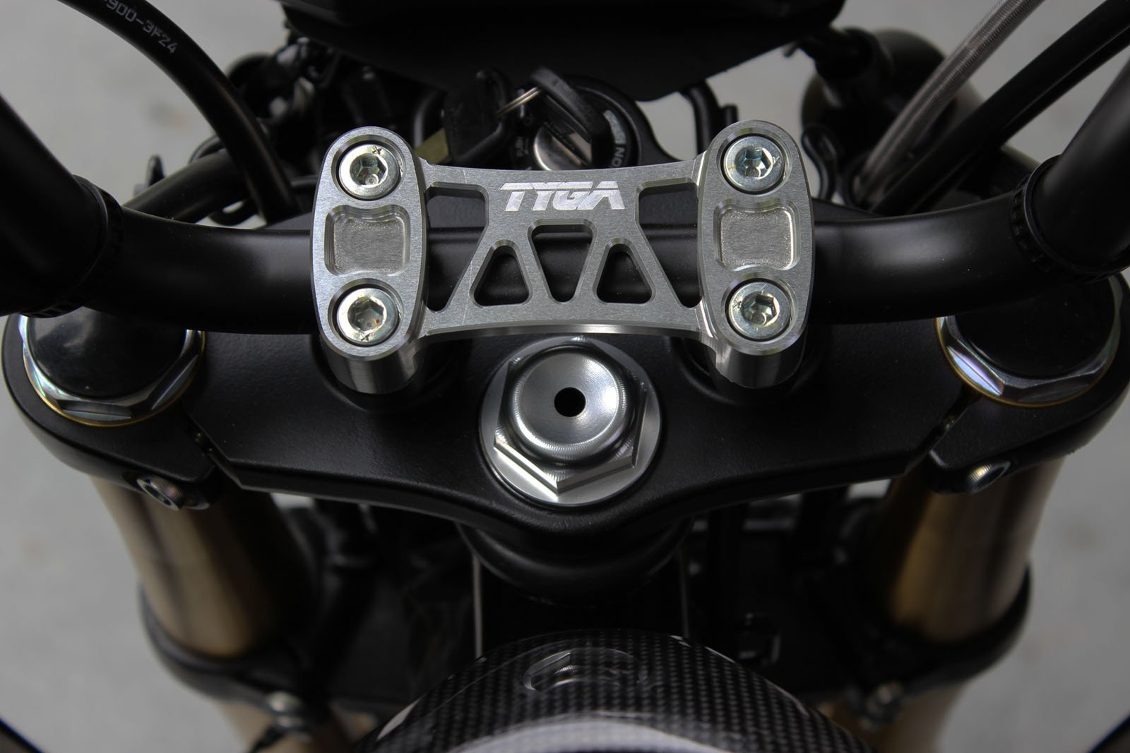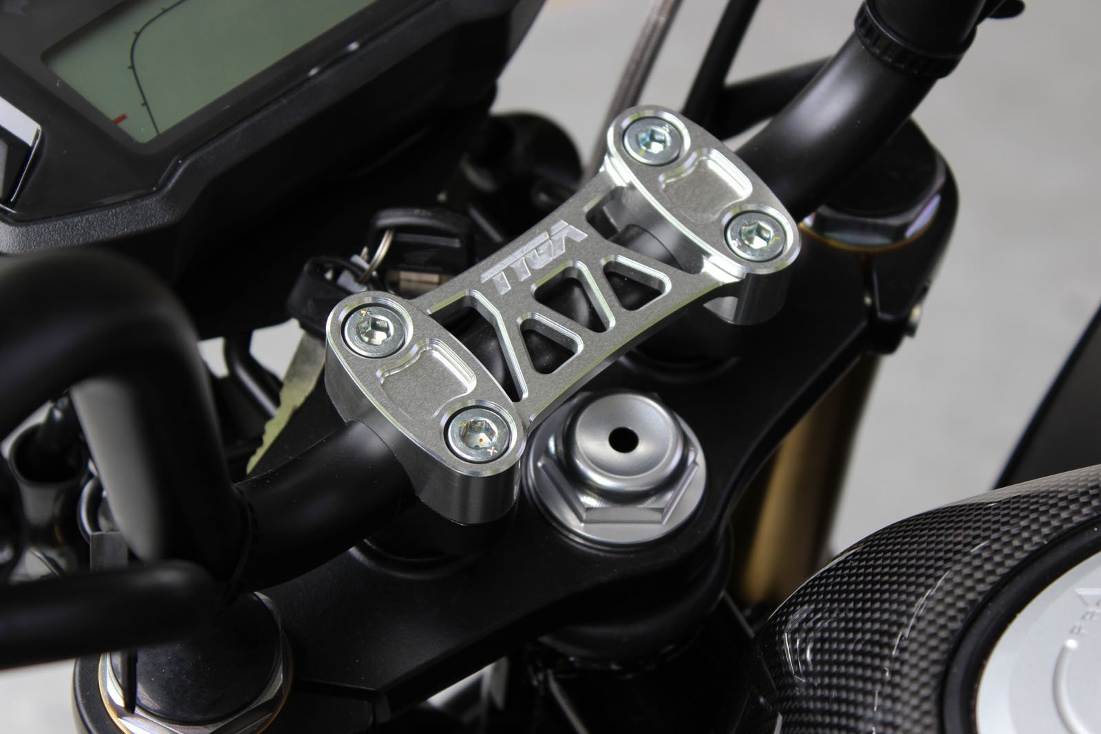 Handlebar clamp CNC machined from 6061 T6 aluminium. Light weight and stylish. Available in two colours, silver or black.