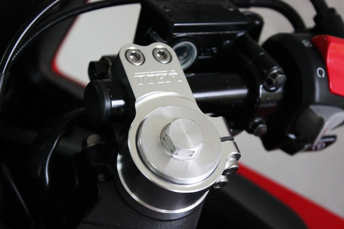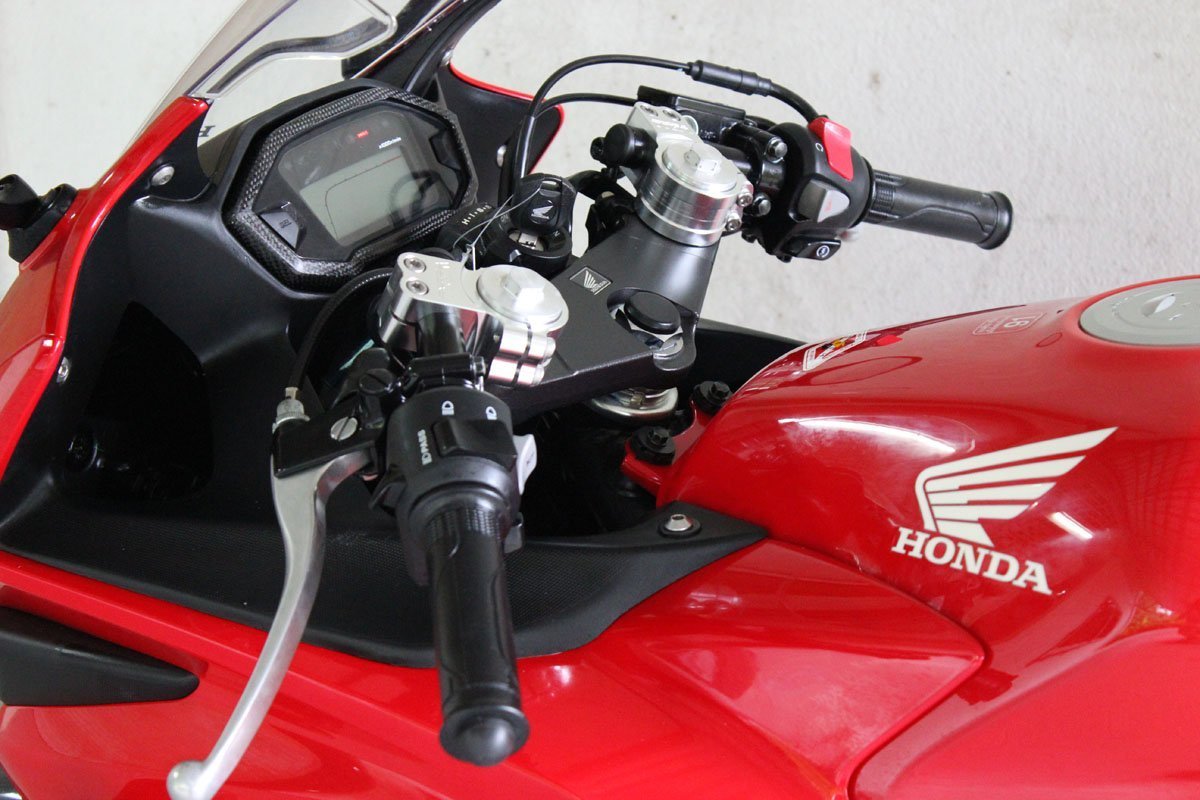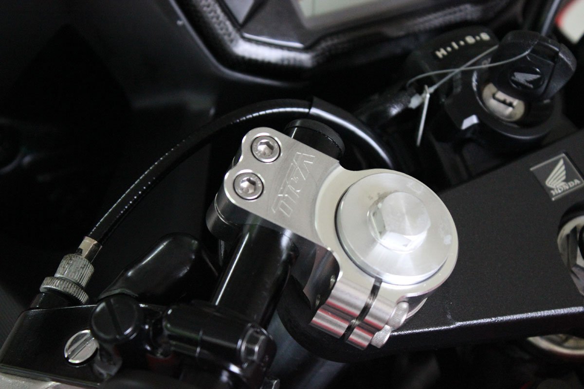 This CNC machined handlebar set is designed to change the handlebars to be up to 25 mm. lower from the stock position giving a more sporting riding position. The ergonomics work very well allowing more weight over the front end for better control, while putting the rider’s upper body lower behind the fairing for better areodynamics and less fatigue at high speed riding.