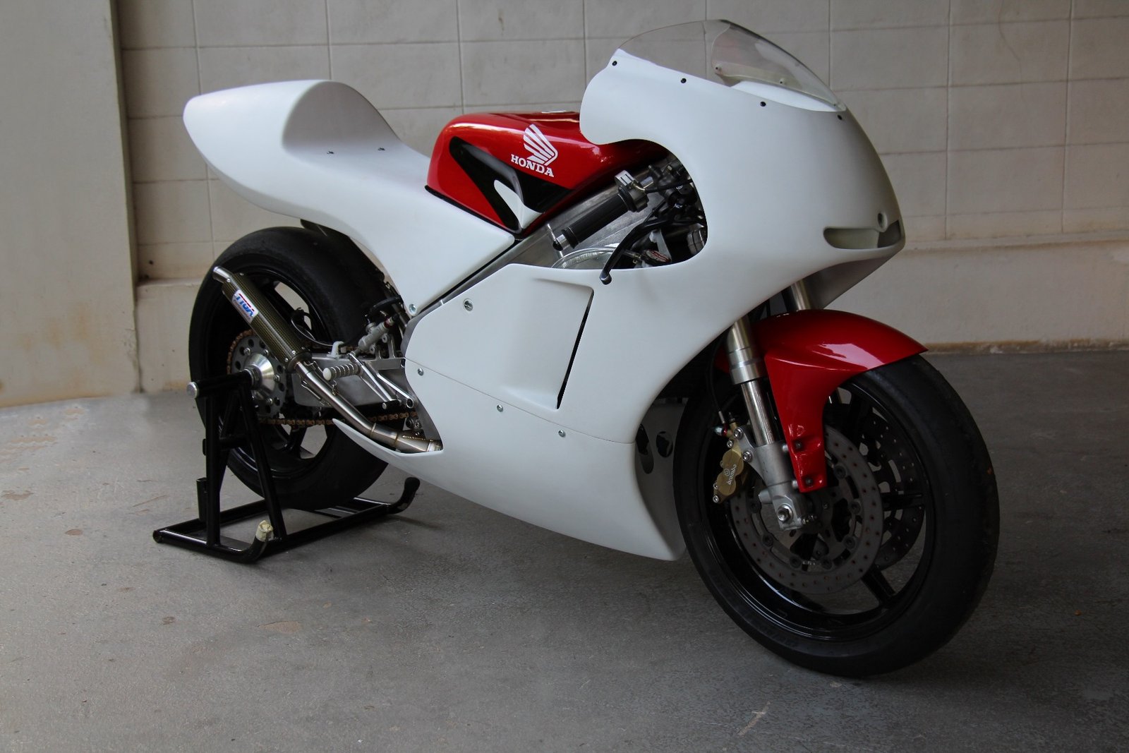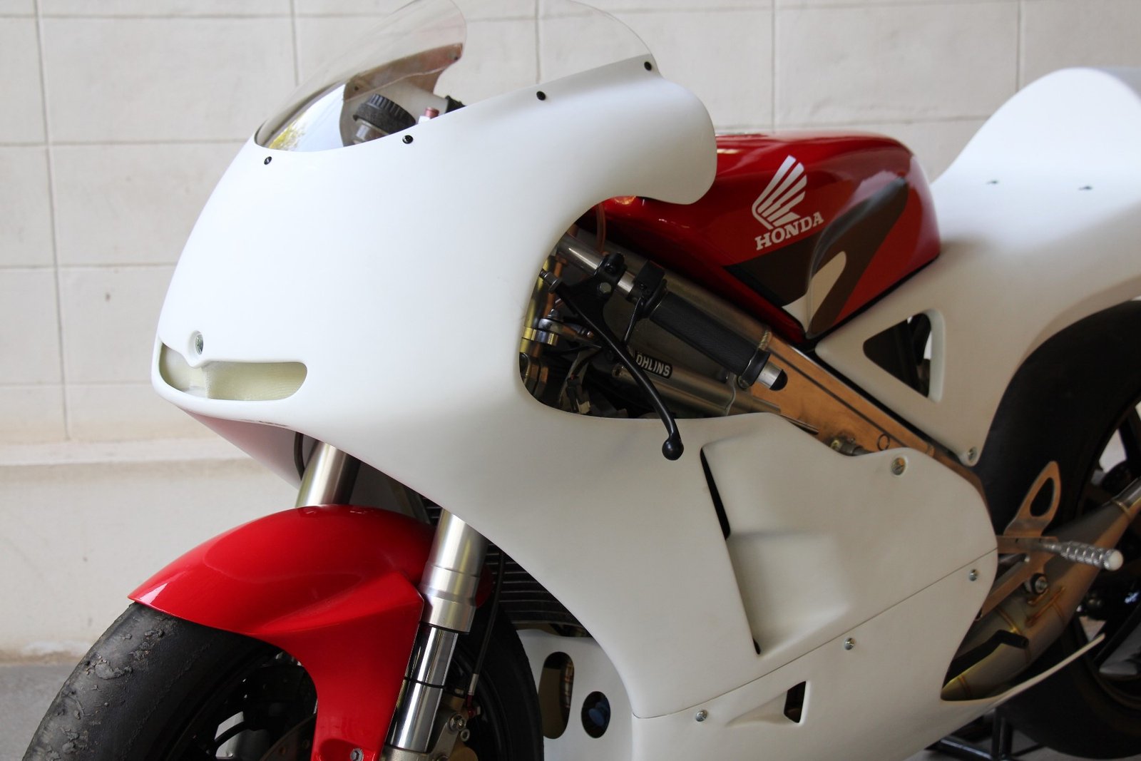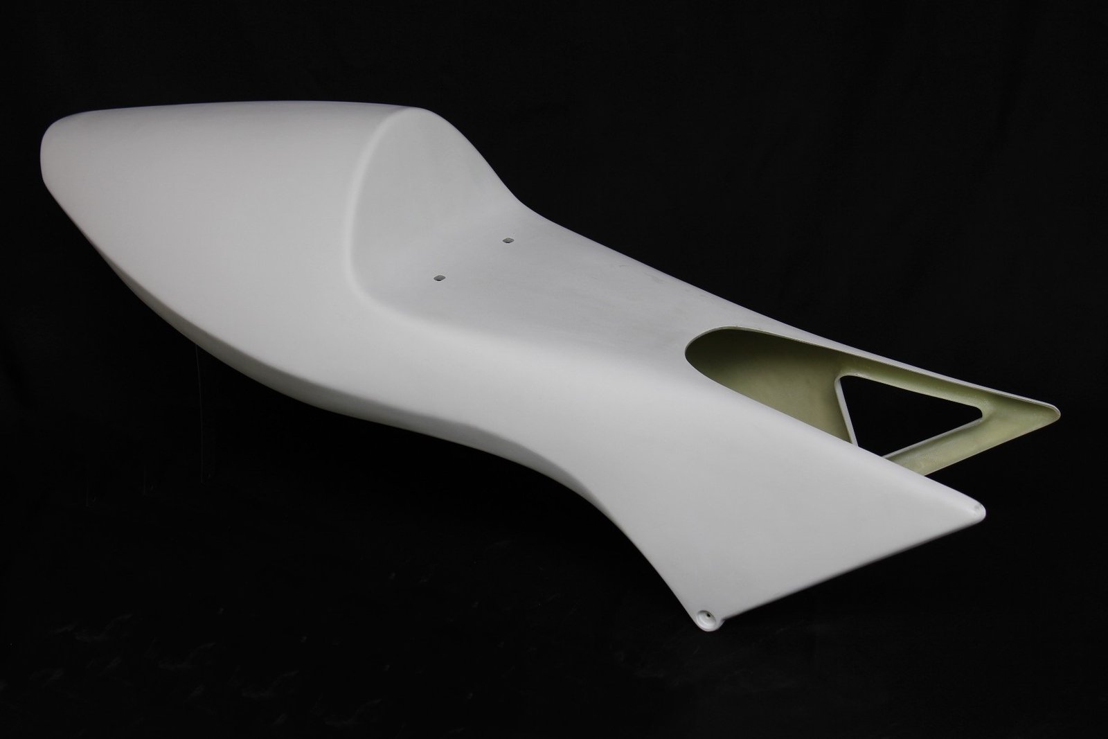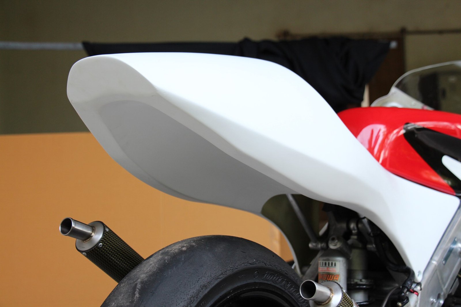 Although the late model stock shape NX5 RS250R works well, to our eyes it is a bit lacking in lines and we prefer the 1995 factory NSR racer look as ridden by Ukawa and Okada. We therefore decided to make a similar style seat cowling which would be a direct fit for the NX5. The seat uses a lightweight aluminium stay to relocate the rear mounting bolts from the sides to the seat pad area and is covered underneath for streamlining and protection of the PGM and connectors. It is easy to install and being made from high quality epoxy resins and top quality glass fabric is strong and crash resistant.