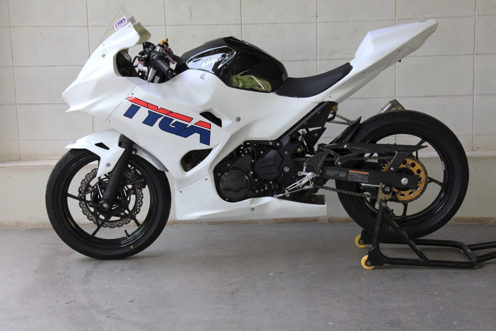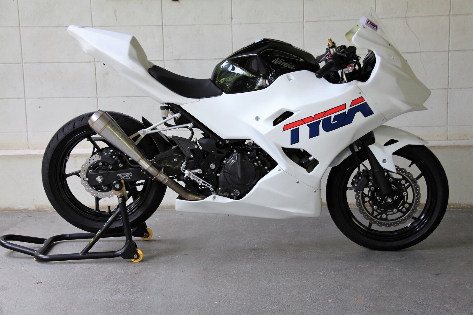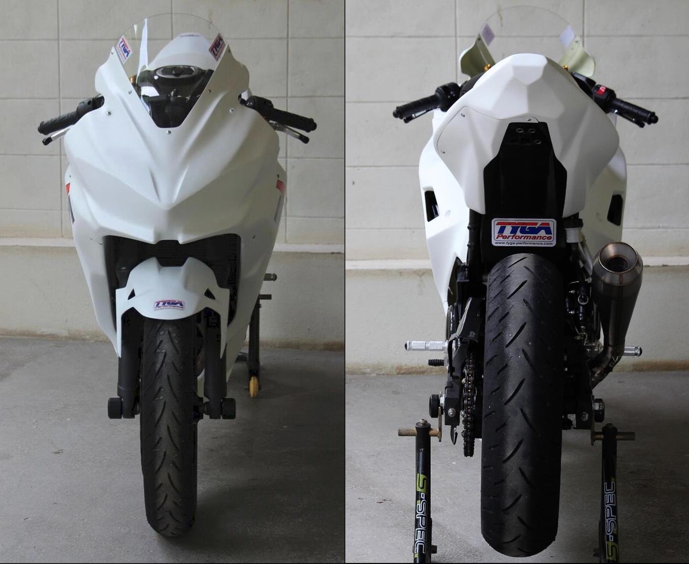 This race fairing kit which is made using GRP (glass reinforced plastic)  is primed and ready for paint**  and has all bodywork components to transform a stock Ninja 400 into a race/trackday bike.