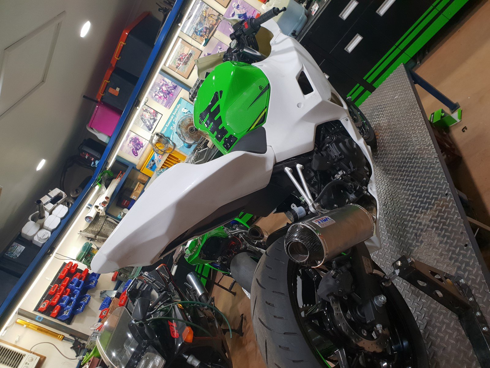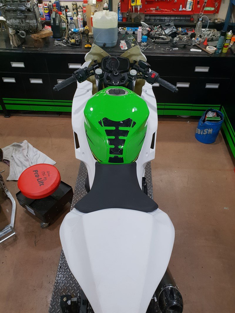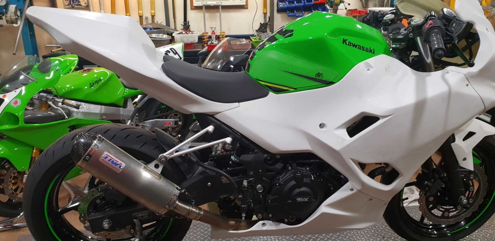 This race fairing kit which is made using GRP (glass reinforced plastic)  is primed and ready for paint**  and has all bodywork components to transform a stock Ninja 400 into a race/trackday bike.