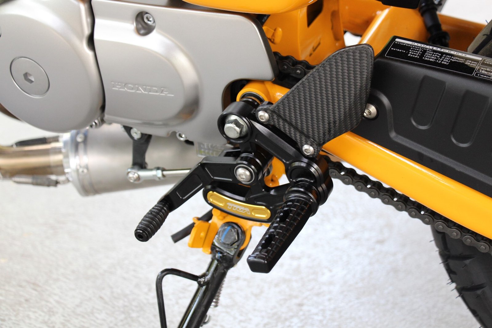 With all major components designed specifically for the Monkey 125 in mind, this rear set kit is the best on the market.  Designed in-house by TYGA Performance using the latest CAD/CAM software, these tough CNC machine-made step kits are made from top quality, aircraft grade aluminium and utilise TYGA’s unique and elegant system to provide ten different foot peg positions. The kit features levers moving on ball bearings to give precise and smooth movement. In addition to the technical specifications, emphasis has also been given to make the steps as uncluttered as possible with the rear master cylinder hidden from view and no unsightly unused holes on view etc. The kit comes complete, ready to bolt on with stainless steel fasteners, new OEM Honda axle bolt and carbon heel guards. With individualism in mind, there is a choice of ten colour combinations available and all components are available as replacement or separate items.
