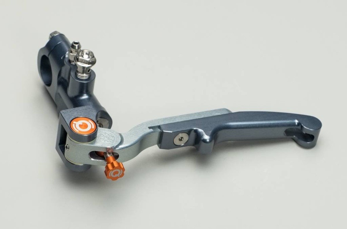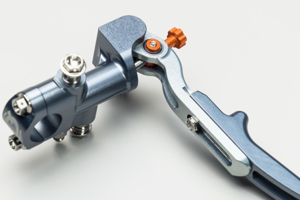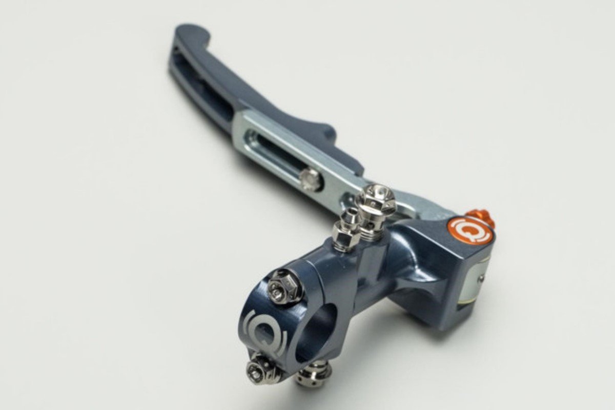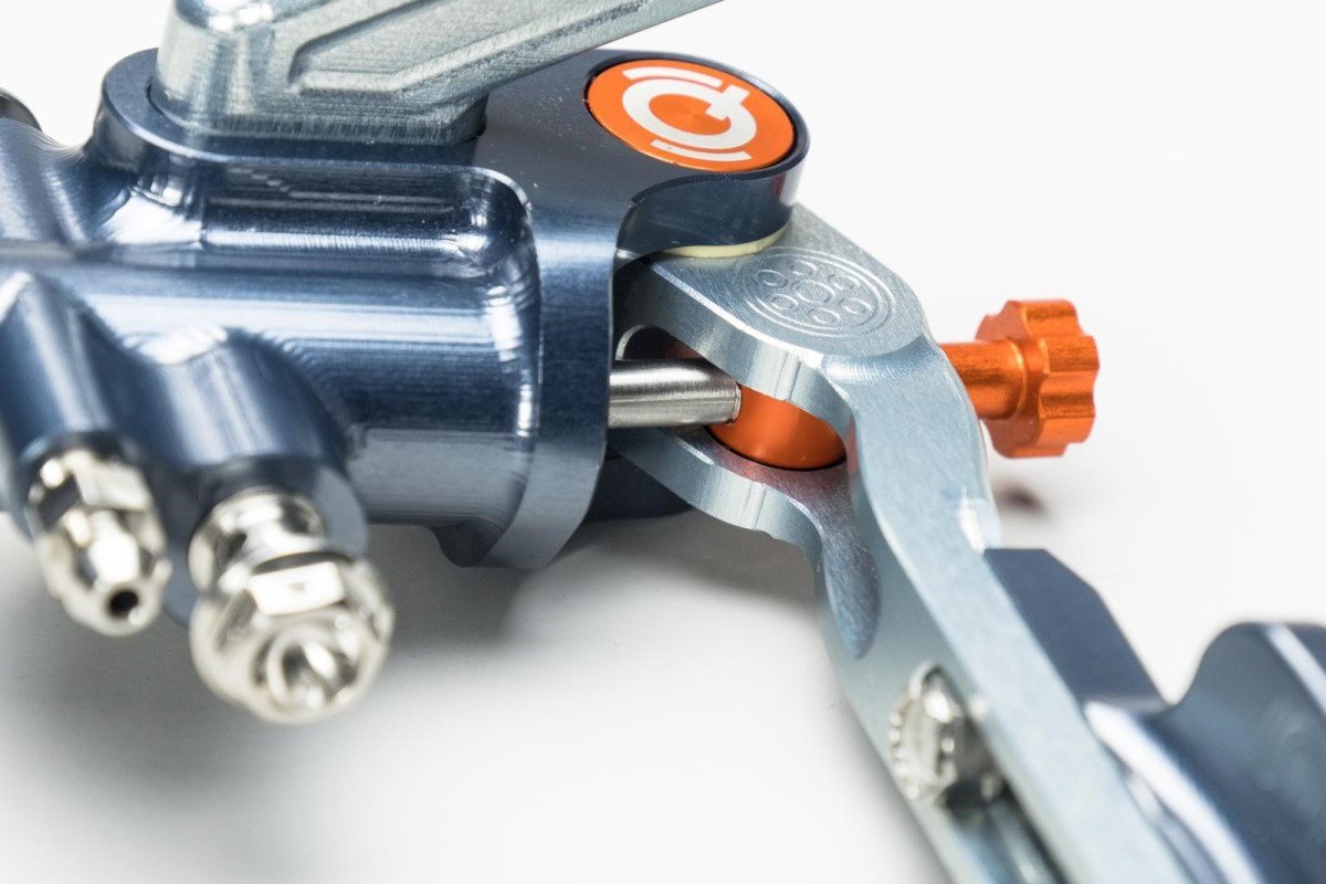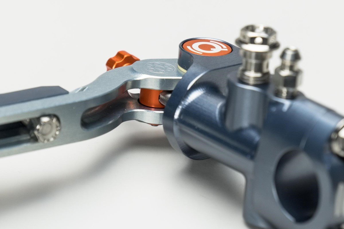 Not everyone prefers the thumb brake, therefore a finger brake has been developed. This finger brake is mounted on the left at the clutch trade. This radial finger brake has the same optimization as the radial thumb brake and is optimized at all points to get the brake feeling at the highest possible level. The pivot point and the pivot point of the handle adjustment are both double bearing, which eliminates the friction of the max. 25 bar pressure in the fulcrum. This results in a lesser force with the fingers to get the same brake pressure. More importantly, the feeling improves so that the rear brake is easier to control