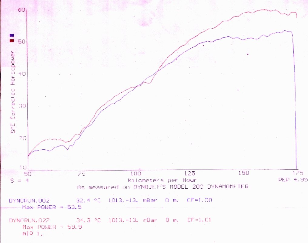 With just the TYGA pipe (red line) and a couple of main jet changes, the power leaps from a stock 52hp up to a healthy 59hp. That’s 7hp, or 13.5% more.