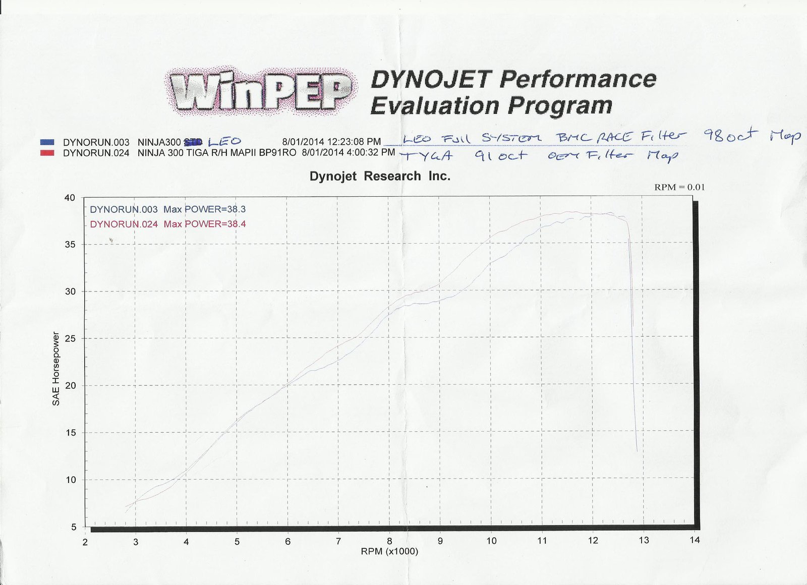 In this graph, the peaks are very similar but look how the TYGA system has more power everywhere else, up to 10% more power in the important 9,000 to 10,000 range. The Leo Vince exhaust was mapped for 98 octane and the Tyga for 91 which should give an advantage to the Leo.