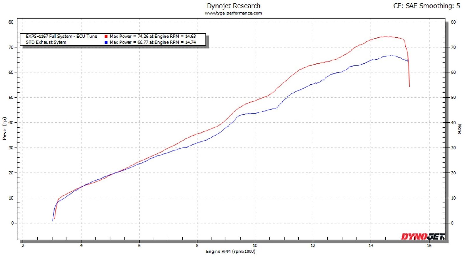 See dyno graph to compare the EXPS-1167 system against OEM. A nice clean gain of 8hp!