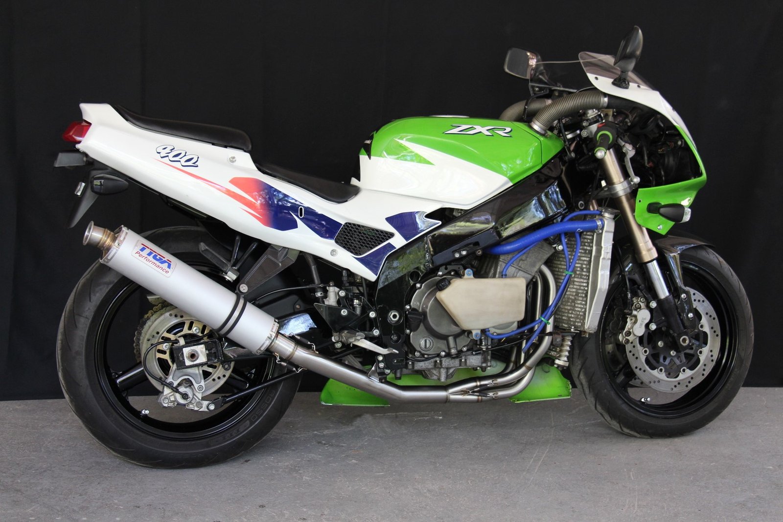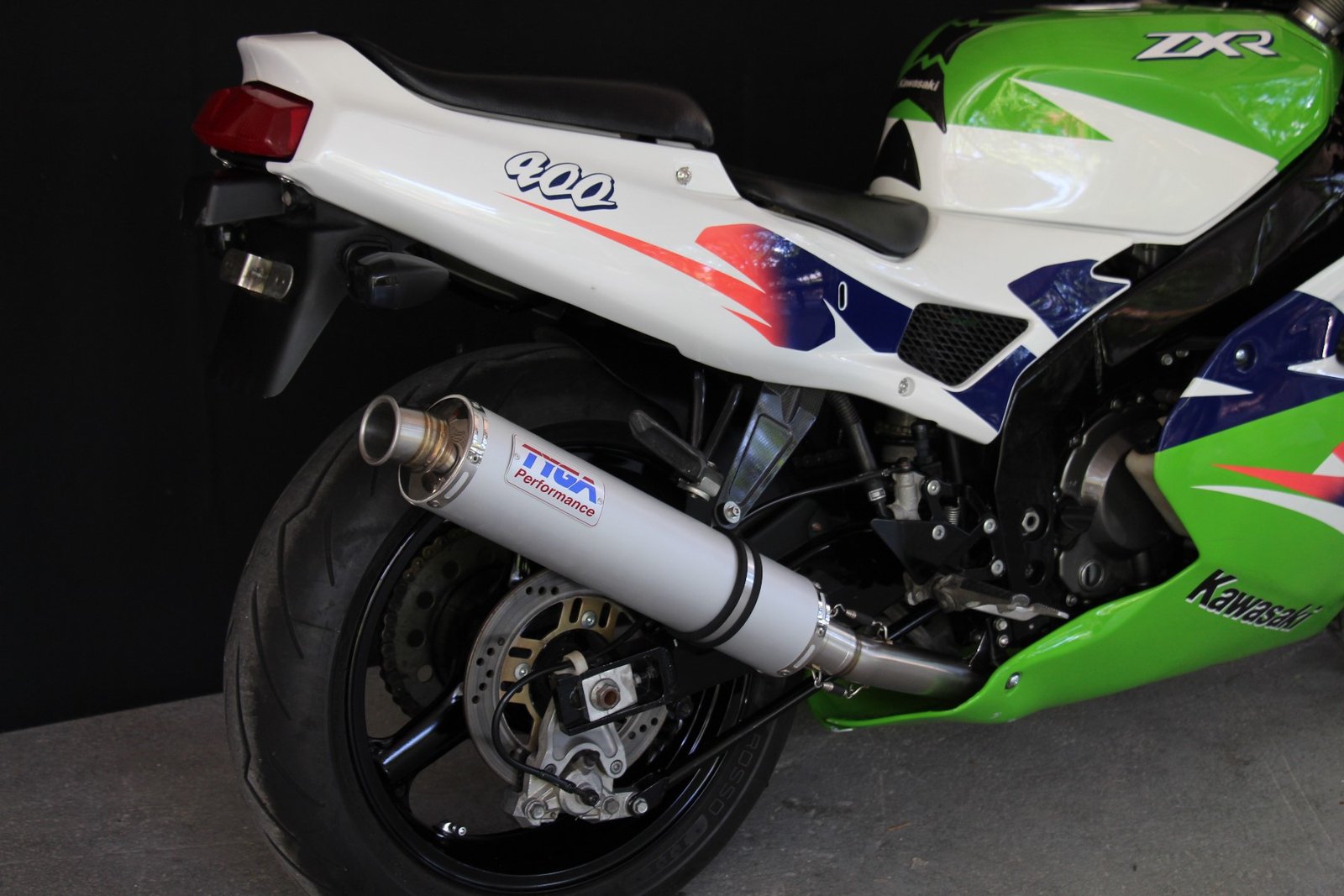 This race system has been specifically developed for the Kawasaki ZXR400L models (L1 up to L9) and has been designed for optimum performance. Linked header pipes for better cylinder filling efficiency over a wide rpm range, and a 4-1 collector allowing maximum power and tuning potential. Made from TIG welded stainless steel sections throughout, with all joints secured by springs. It uses a 450 mm long aluminium round silencer to keep sound to a minimum. As well as the improved performance, it saves weight over the stock system and of course, it looks awesome!