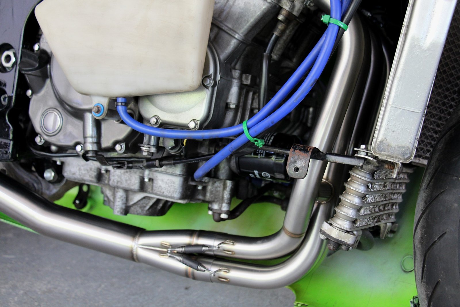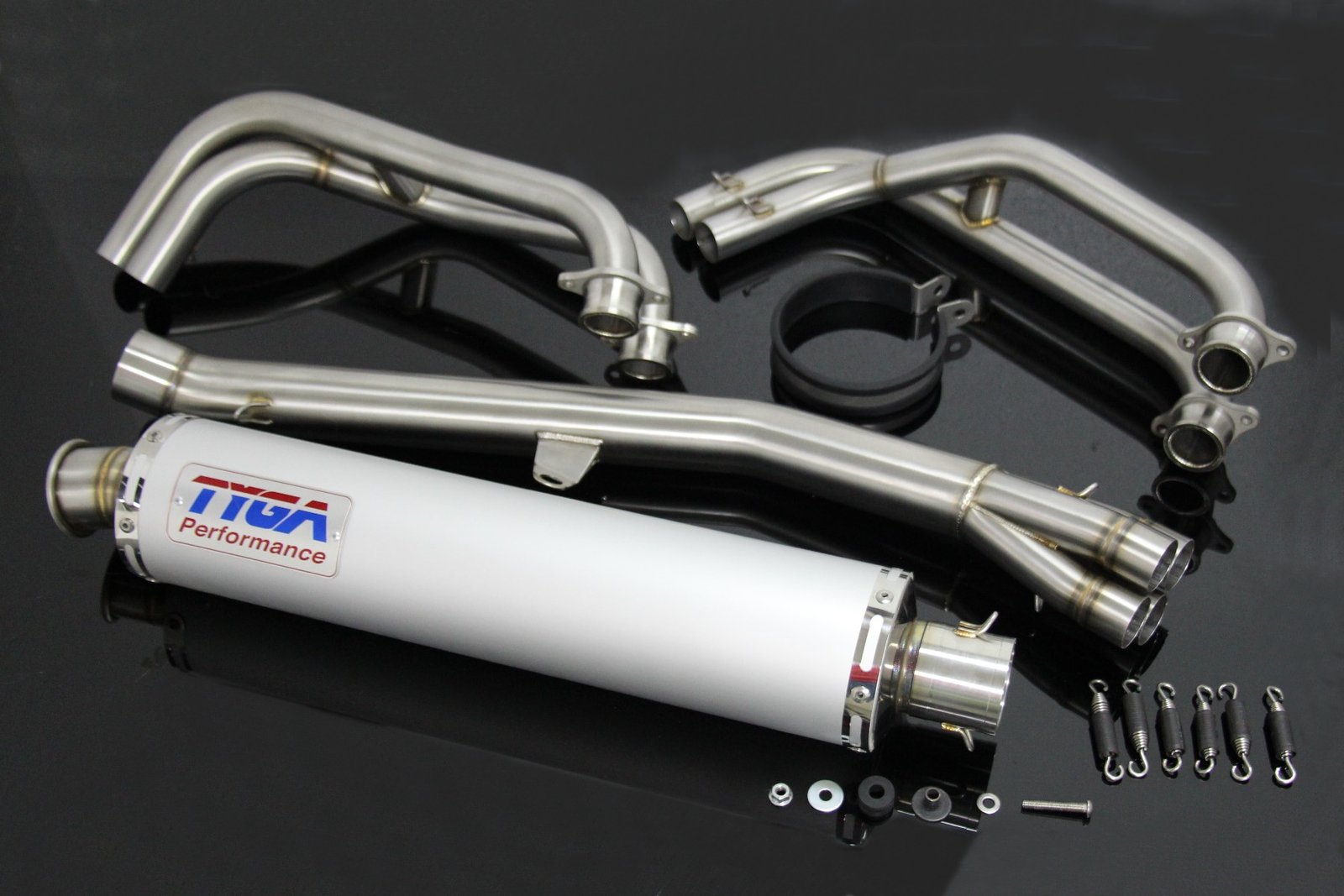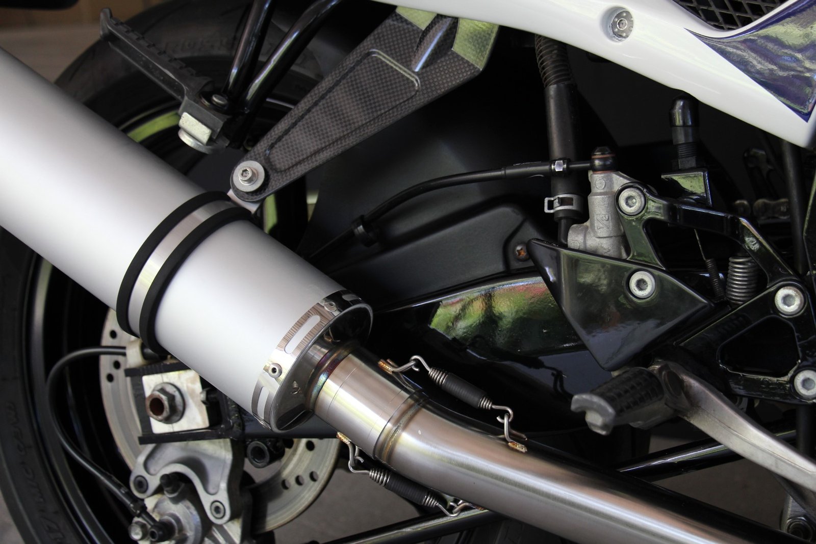This exhaust can be installed on a bike fitted with the stock or with race bodywork and with or without the passenger pegs installed.