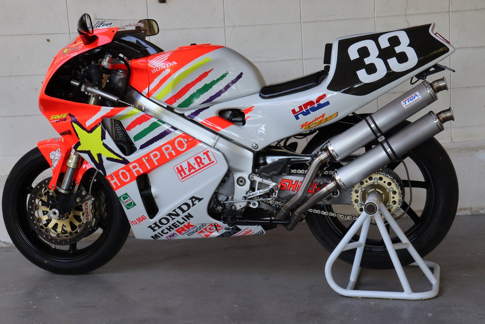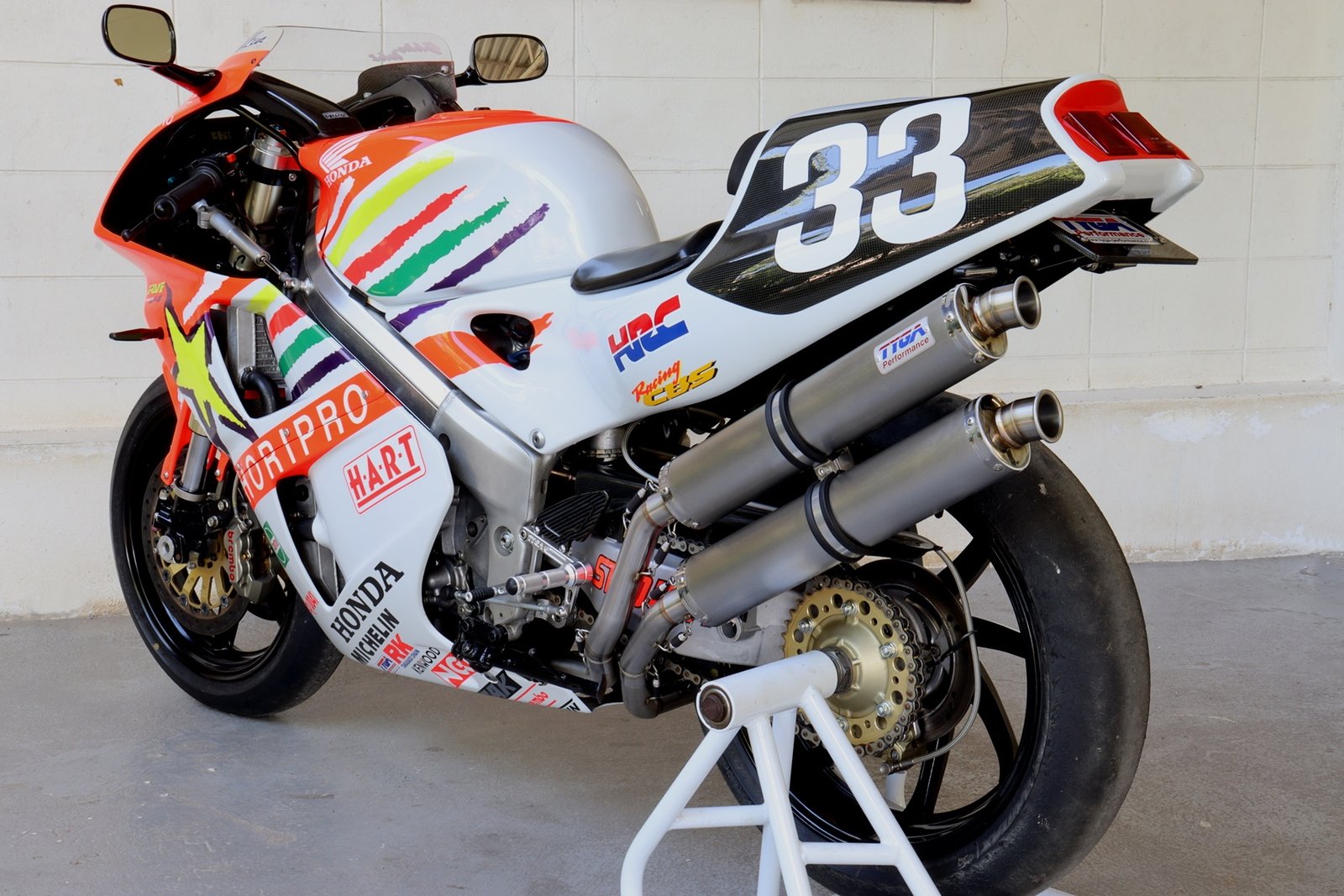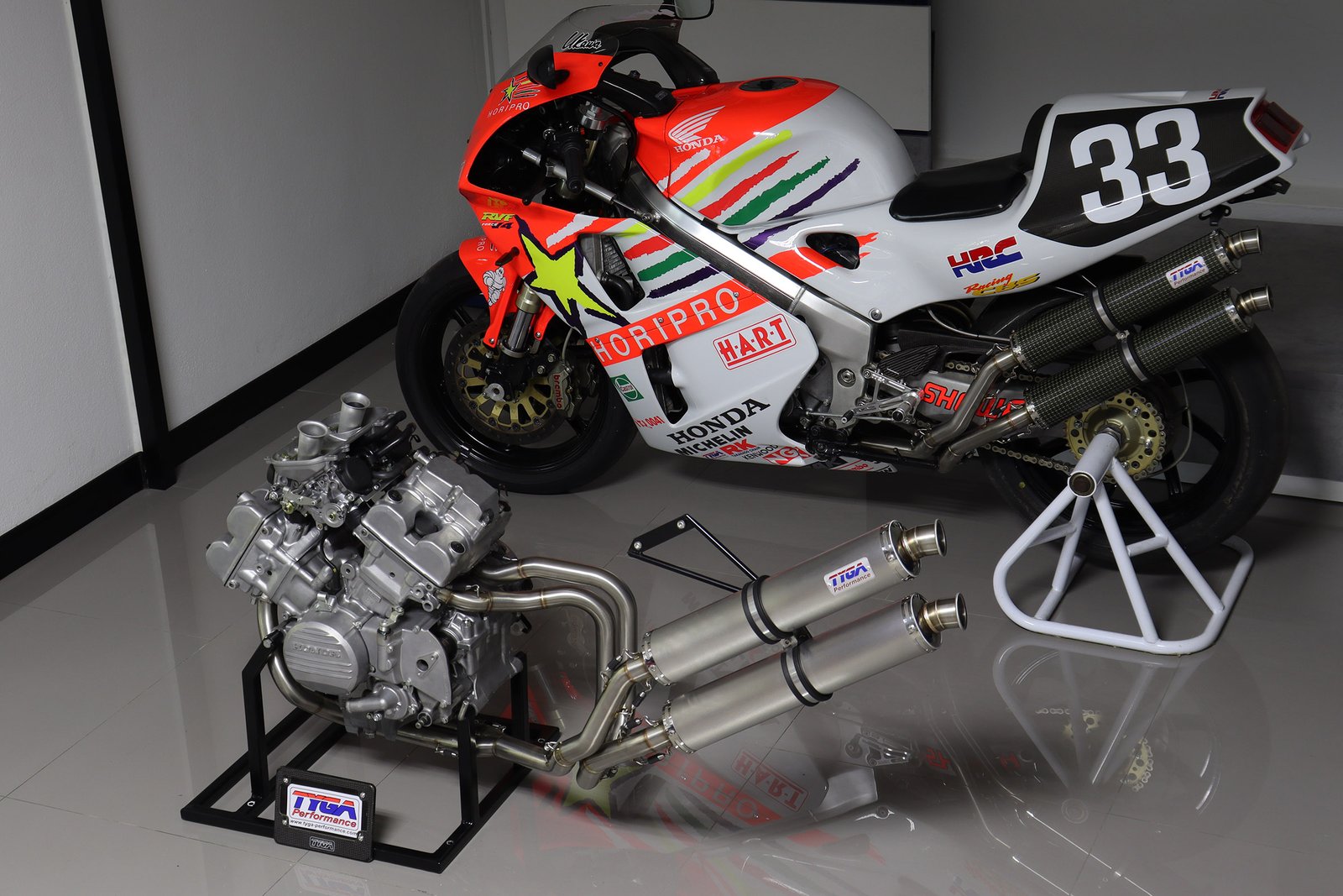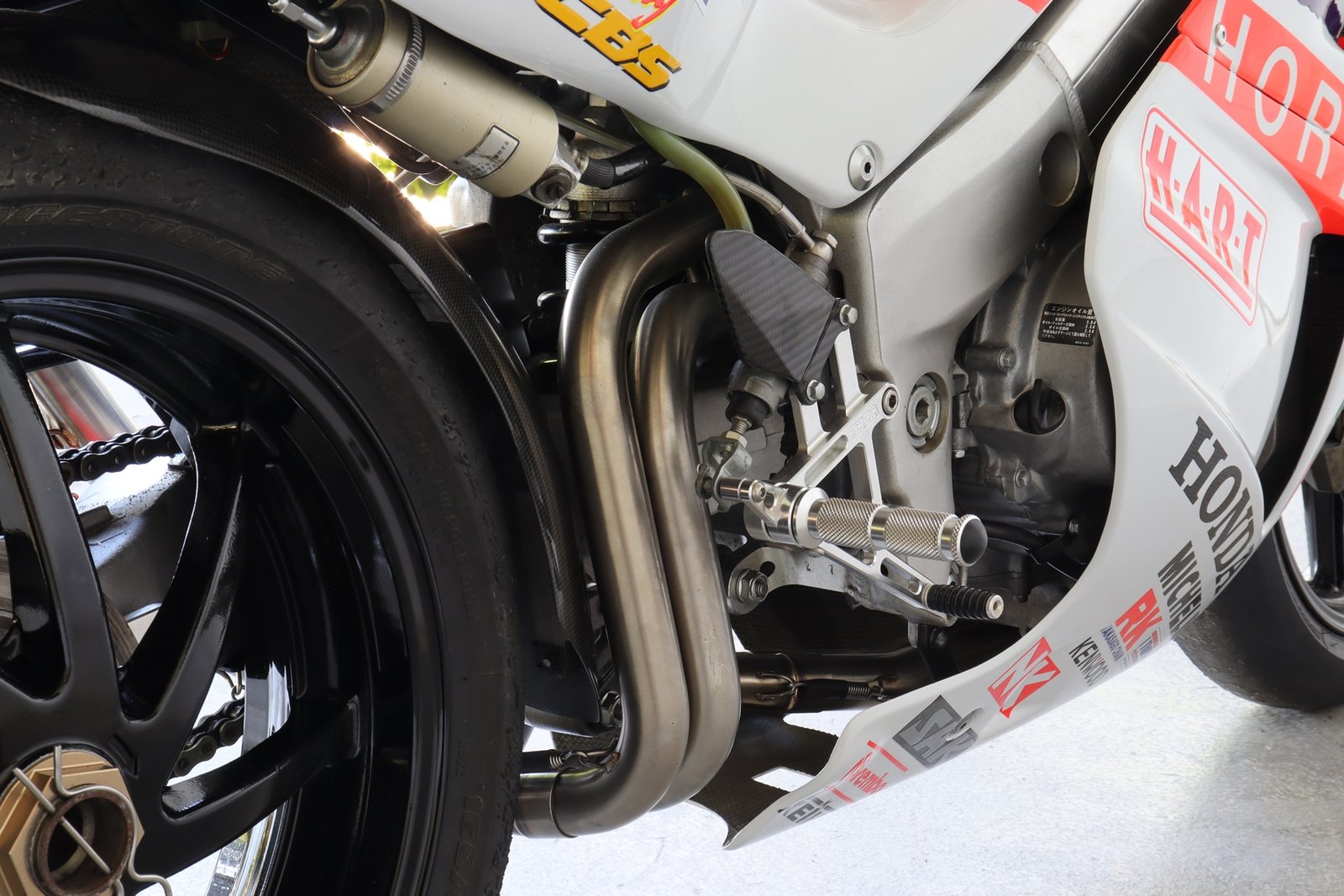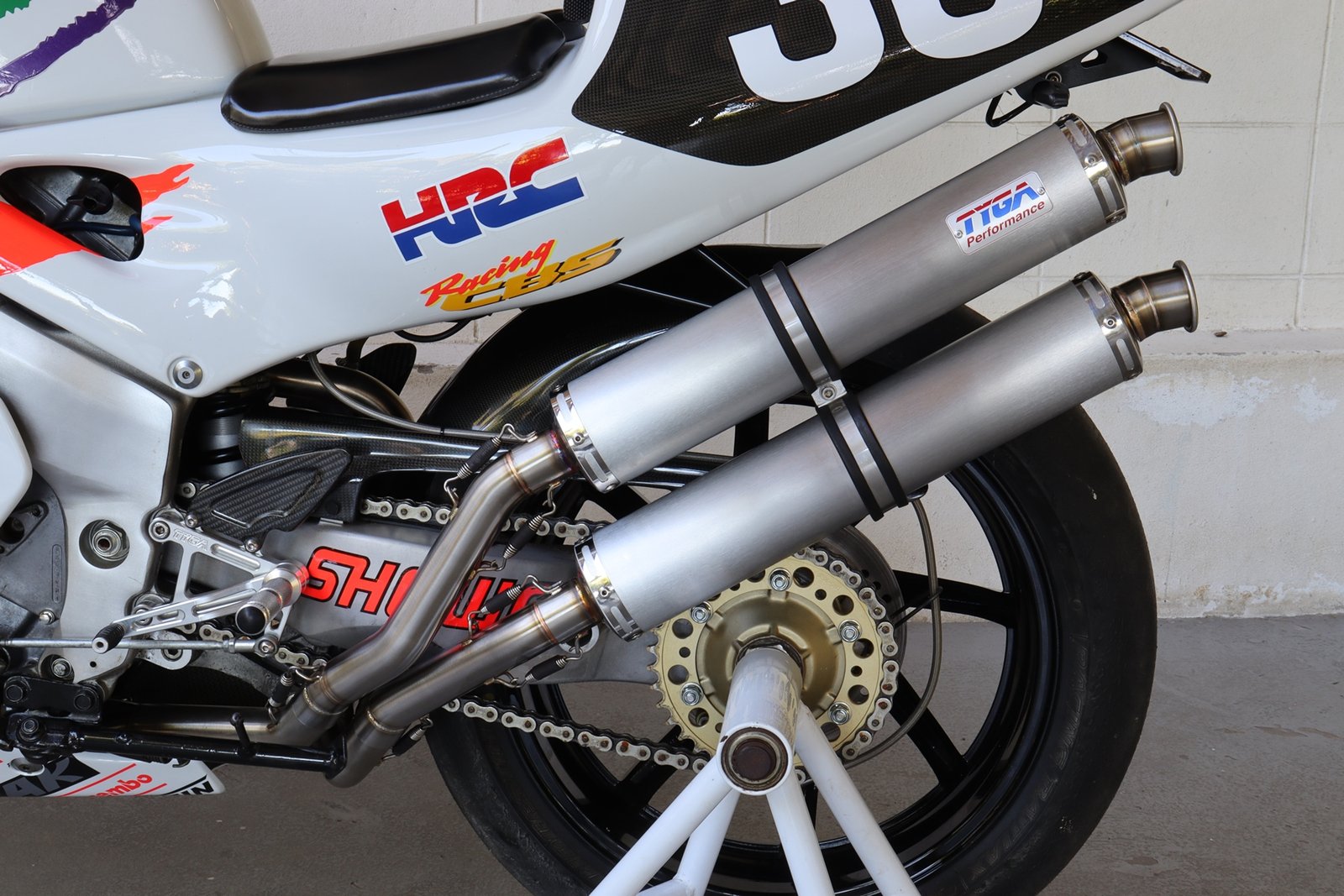 This system can be used with stock subframe and Honda or Tyga bodywork and is designed to be used on a race bike. It requires removal of passenger pegs and stock turn signals due to the position of the silencers. See also EXPS-0003 and EXPS-0005 for a TYGA twin stack system which can be used on a street bike with these components installed.