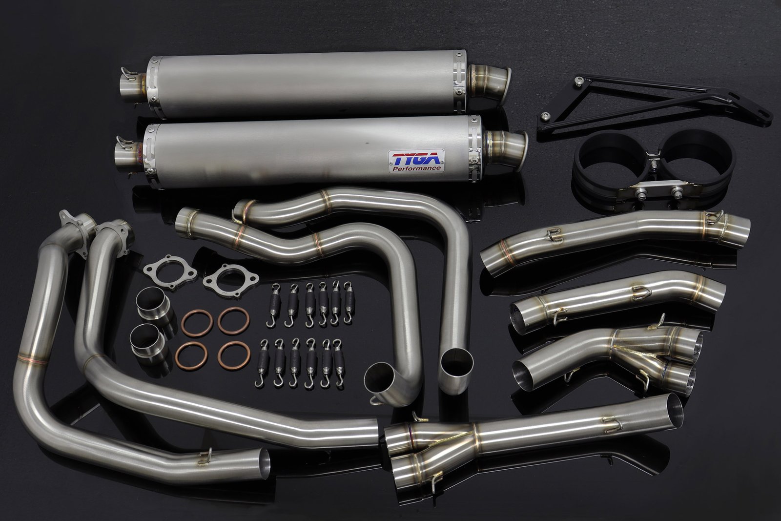 This exhaust system includes everything you need to replace the stock system. It includes, stainless pipe work, twin stainless silencers (length 450mm), springs, gaskets, silencer clamp, mounting stay and all other mounting hardware.