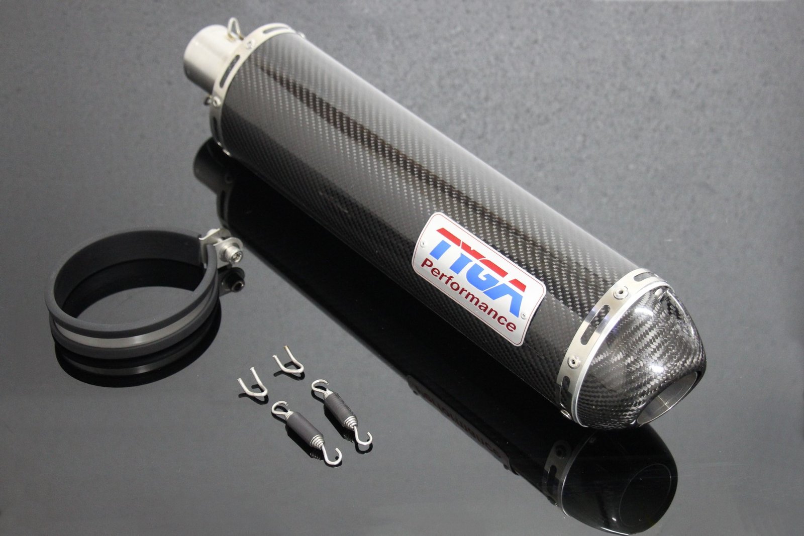 The ‘slip-on’ mount is 2″ internal diameter, so is compatible with our existing TYGA NC30/35 and VFR750F pipes and any other system with a 2″ external diameter tail pipe. It is secured in place with two springs, which align with the spring hooks already fitted to the TYGA pipe.