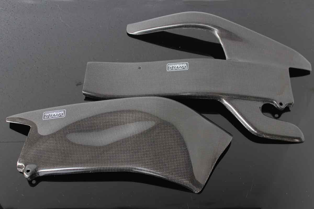 These lightweight carbon covers fit over the stock swing arm and it is designed to protect against scratches and damage to your swing arm in the event of an accident. The right side also incorporates a ‘sharkfin’ compulsory in some classes of racing.