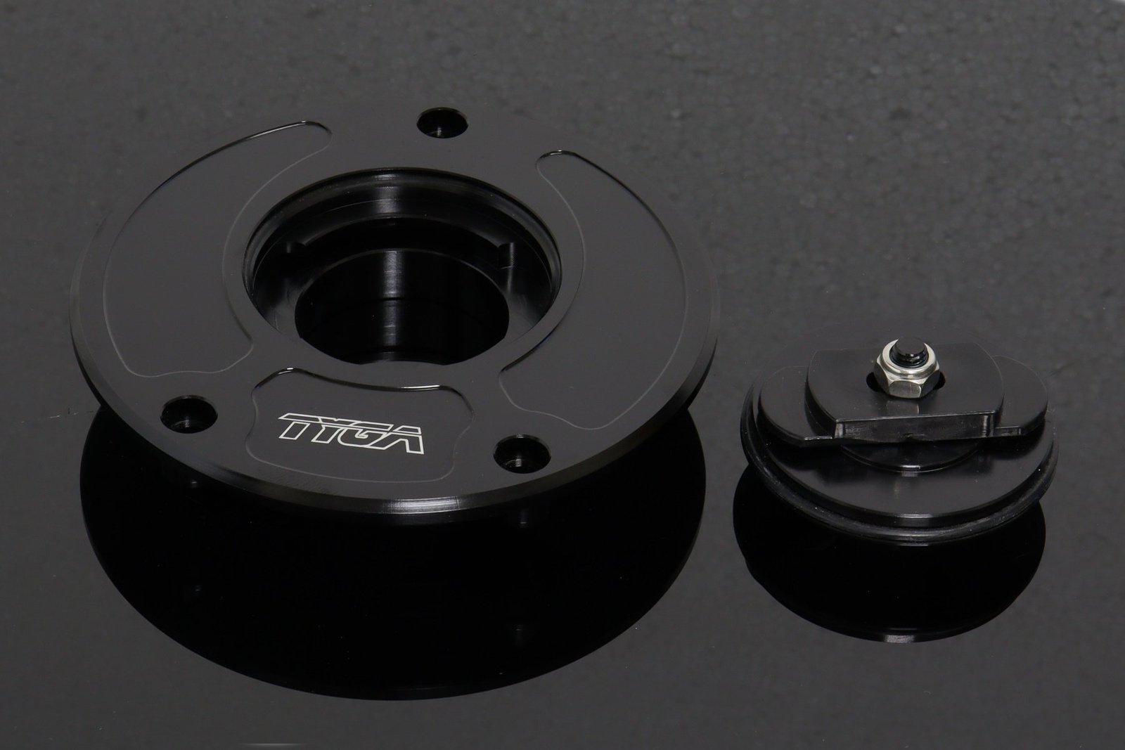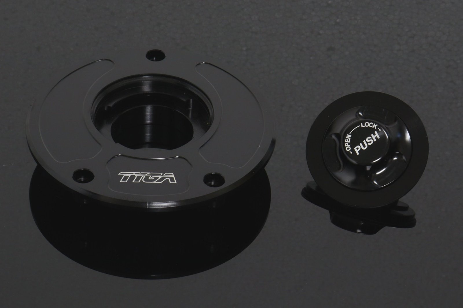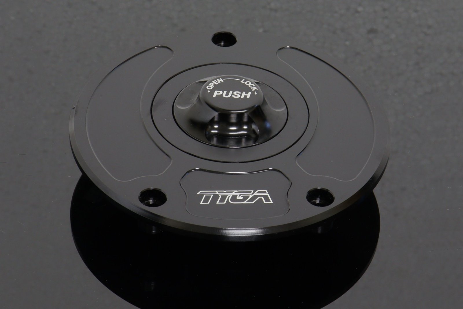 This keyless racing fuel tank filler cap is CNC machined from billet aluminium and anodised black with a laser etched TYGA logo. Designed with finger tabs for easy removal while wearing gloves
