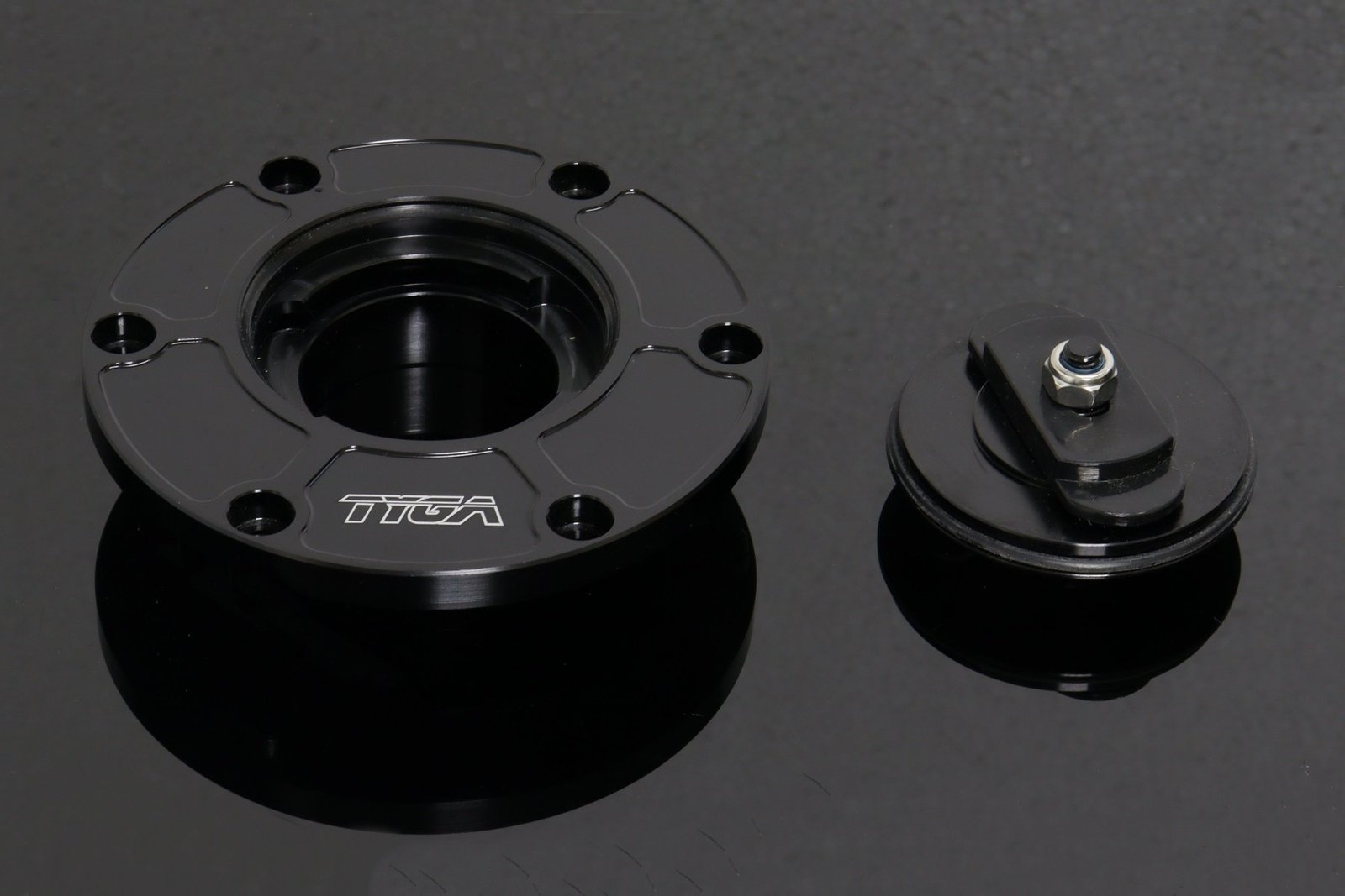 This keyless racing fuel tank filler cap is CNC machined from billet aluminium and anodised black with a laser etched TYGA logo. Designed with finger tabs for easy removal while wearing gloves