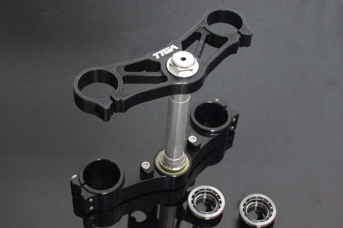 This CNC machined triple clamp set has been modified from the ‘normal’ NC35 design to allow MC28 owners to fit NC35 forks to their machine.