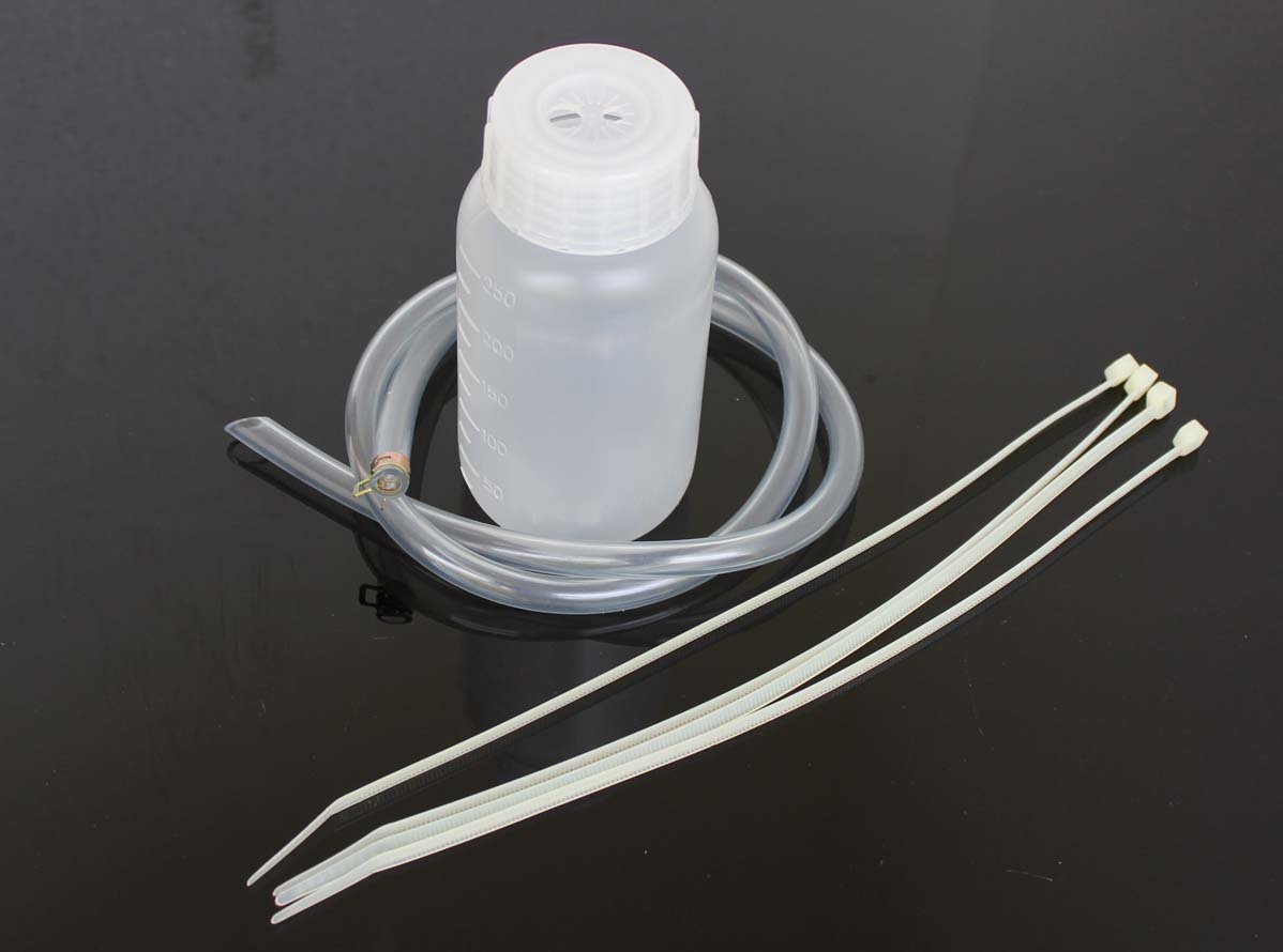 Comprising clear pp plastic bottle, overflow tube and cable ties, this useful lightweight product is ideal for race bikes and for specials and repalces the cumbersome and ugly stock item.