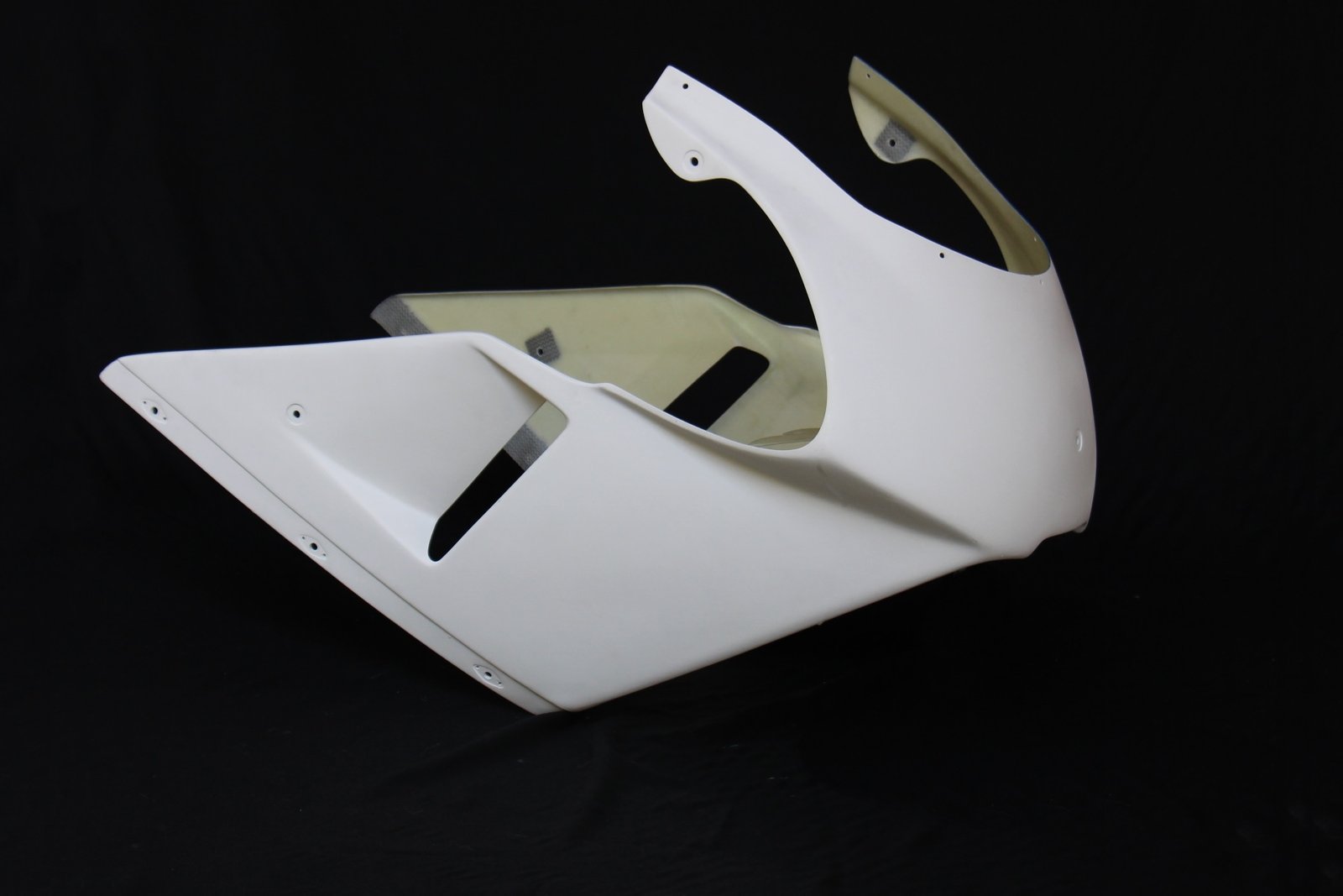 This product along with our NSR500V lower, part number BPFT-9042, air duct BPCX-9042, and windscreen SCRE-0172, comprise the complete front fairing ( part number BPFS-0193) These panels can be used for replacements by the few lucky owners who already have an NSR500V or to owners of motorcycles looking for something different and this fairing gives customizers a starting point to make their dreams come true. The size is such that this fairing can be used on most 400-750 cc model sports bikes and it is even rumoured that KTM ran the prototype RC8 with an NSR500V fairing to hide its identity from prying eyes. See also part number BPCU-9042 for carbon version.