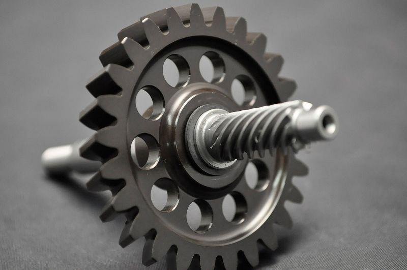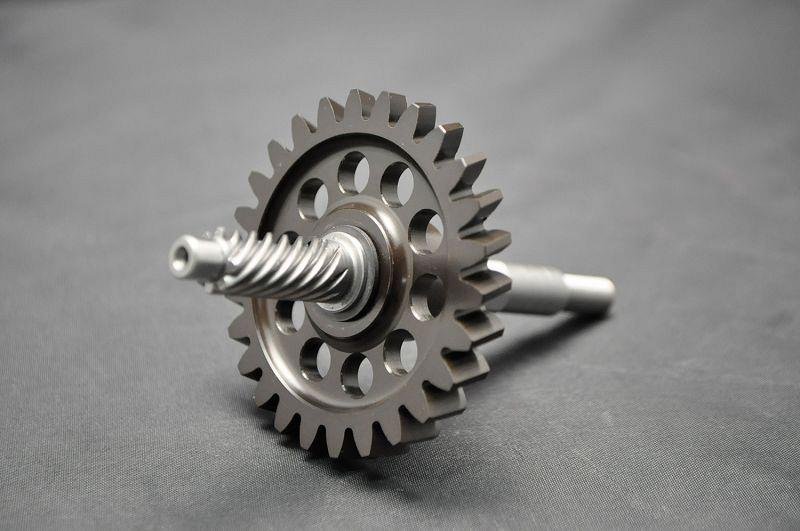 High quality hard anodized aluminium gear, on precision ground shaft.
