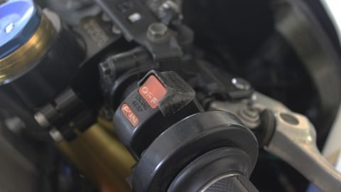 The handle bars are TYGA and are in the stock positon but due to the rear being raised, makes the riding positon more modern and you are no longer sitting in the bike but on top with plenty of room to move around. While sitting on the bike, you can also spot other TYGA components in the cockpit area such as the carbon frame in-fills, brake reservoir stay, instrument surround, kill switch cover and instrument bevel covers. Unfortunately, nearly every NC30 speedo has the clutch adjuster graze on it where the clearance on full steering has been insufficient. The carbon cover is a neat way to hide this scar while enhancing the sporting image. Referring back to the kill switch cover, this is something used in Moto2 to prevent accidental use in a race environment.